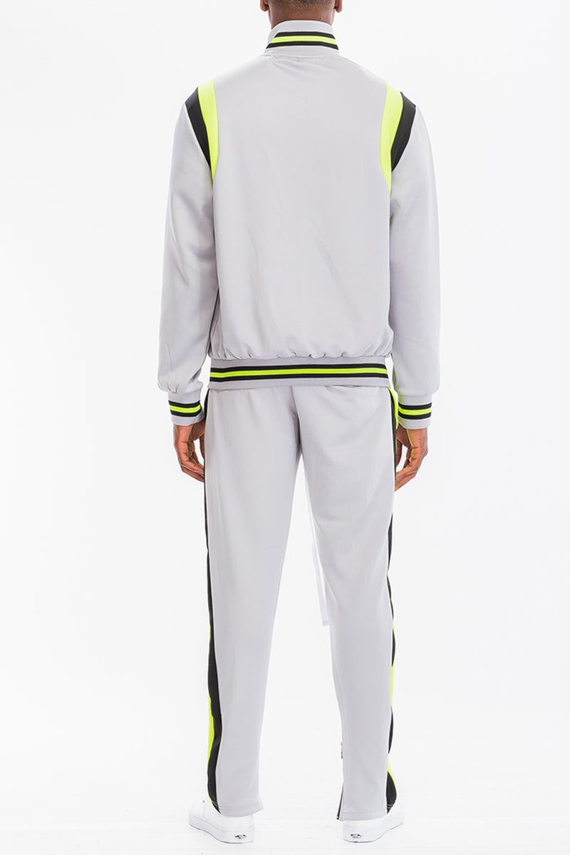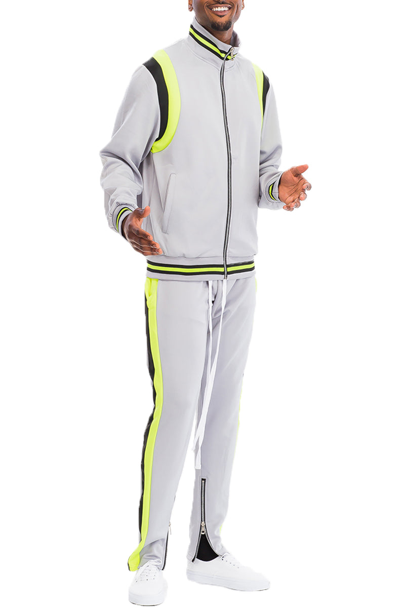 This full track jacket and pant track set is quality to the tee. Dual chevron stripe along the arm and shoulder rim and down the side of bottoms. Standout collar and cuffs with the same dual stripe detail. Full zip track jacket with elastic waist and drawstring track pants.